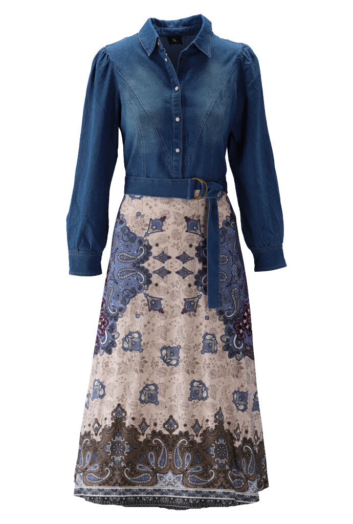 K-design - Maxi dress met vaste jeansblouse, jeansriem en afneembare onderrok (X362)