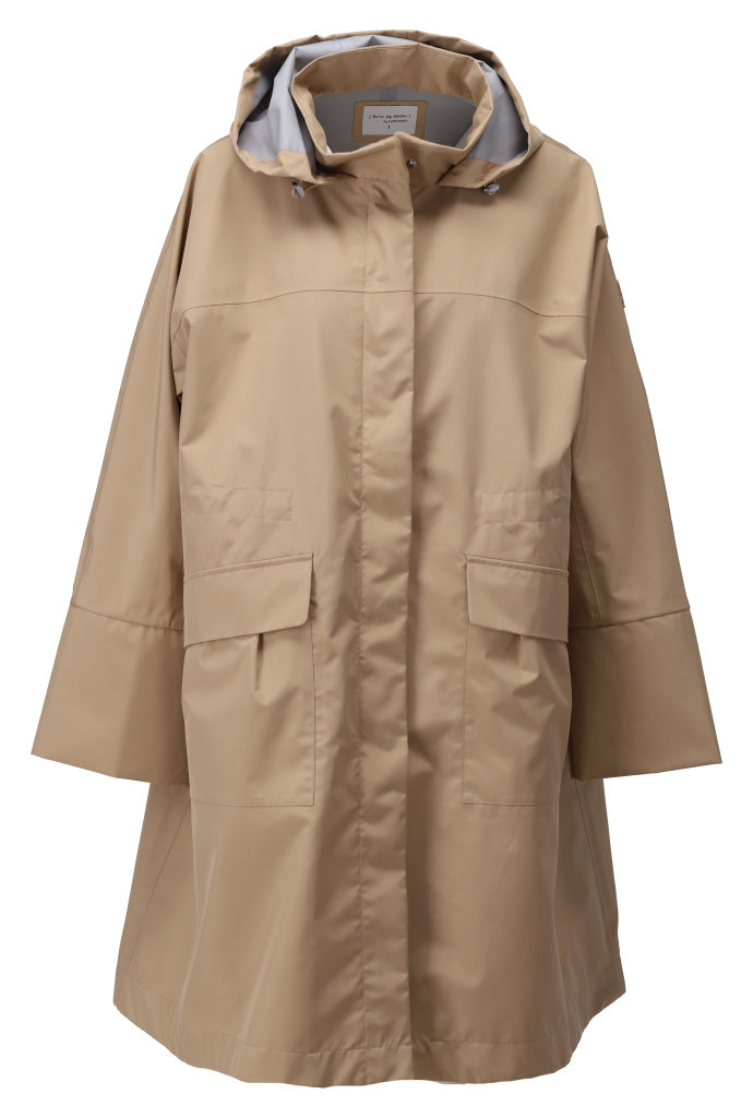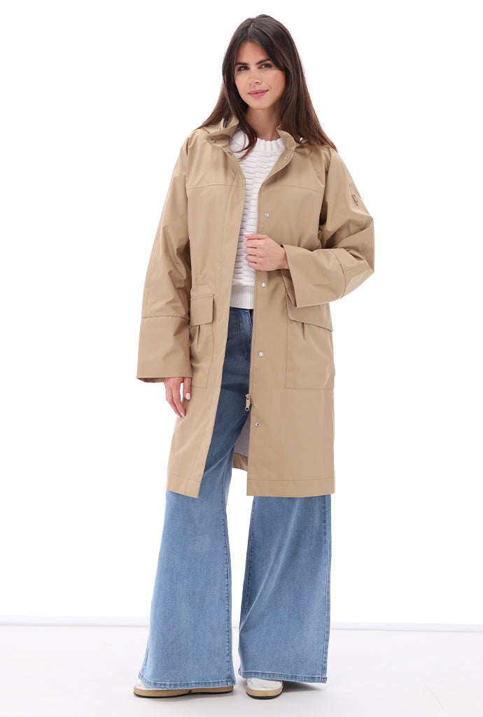 De K-design regenjas van midi-lengte biedt een stijlvol antwoord op regenachtige dagen. Met een elegante A-lijn snit en een moderne, minimalistische uitstraling, is deze jas ontworpen om zowel functionaliteit als fashion te combineren. De jas valt tot de knie en heeft een flatterende pasvorm die je figuur mooi omhult zonder volume toe te voegen.