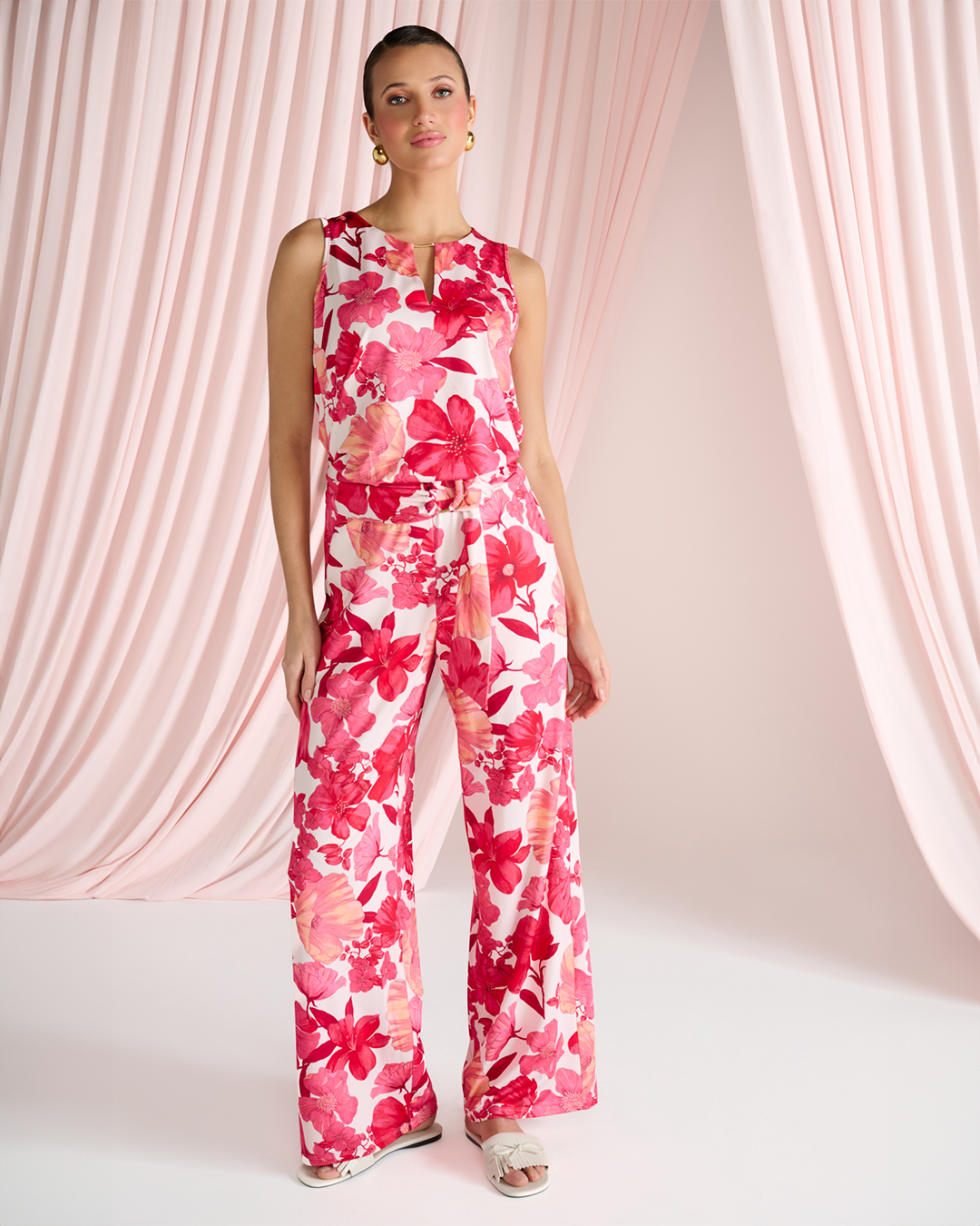 Deze jumpsuit van K-design is een ware eyecatcher met zijn levendige bloemenpatroon. Het mouwloze design en de ruime broekspijpen geven het een luchtige en elegante uitstraling. De jumpsuit accentueert het figuur subtiel met een getailleerde tailleband waardoor een vrouwelijke vorm wordt gecreëerd. Perfect voor zowel casual als elegante gelegenheden, deze jumpsuit kan gemakkelijk worden gestyled met een paar sandalen voor een zomerse dag of met hakken voor een avondje uit. Voeg eenvoudige sieraden en een clutch toe om de look compleet te maken. Laat je persoonlijkheid stralen met dit stijlvolle en veelzijdige kledingstuk.