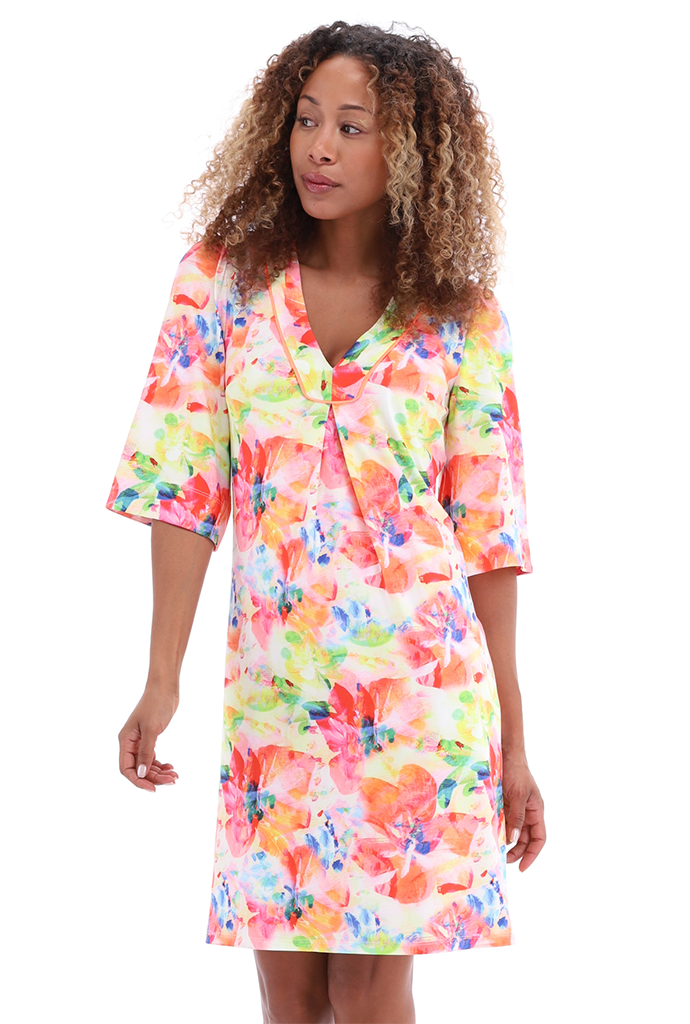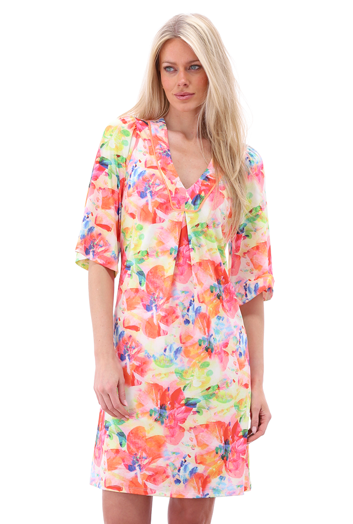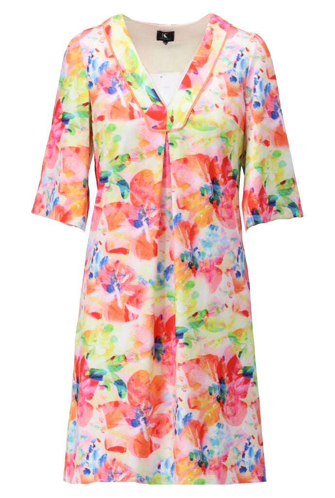 Deze mini dress van K-Design is een ware kleurenexplosie die instant vrolijkheid brengt! De speelse bloemenprint in felle roze-, oranje-, geel- en blauwtinten doet denken aan een zomerse schildering. De vrouwelijke V-hals en de soepelvallende snit maken deze jurk heerlijk luchtig en flatterend. Een perfecte keuze voor een zonnige dag waarop je wil stralen.