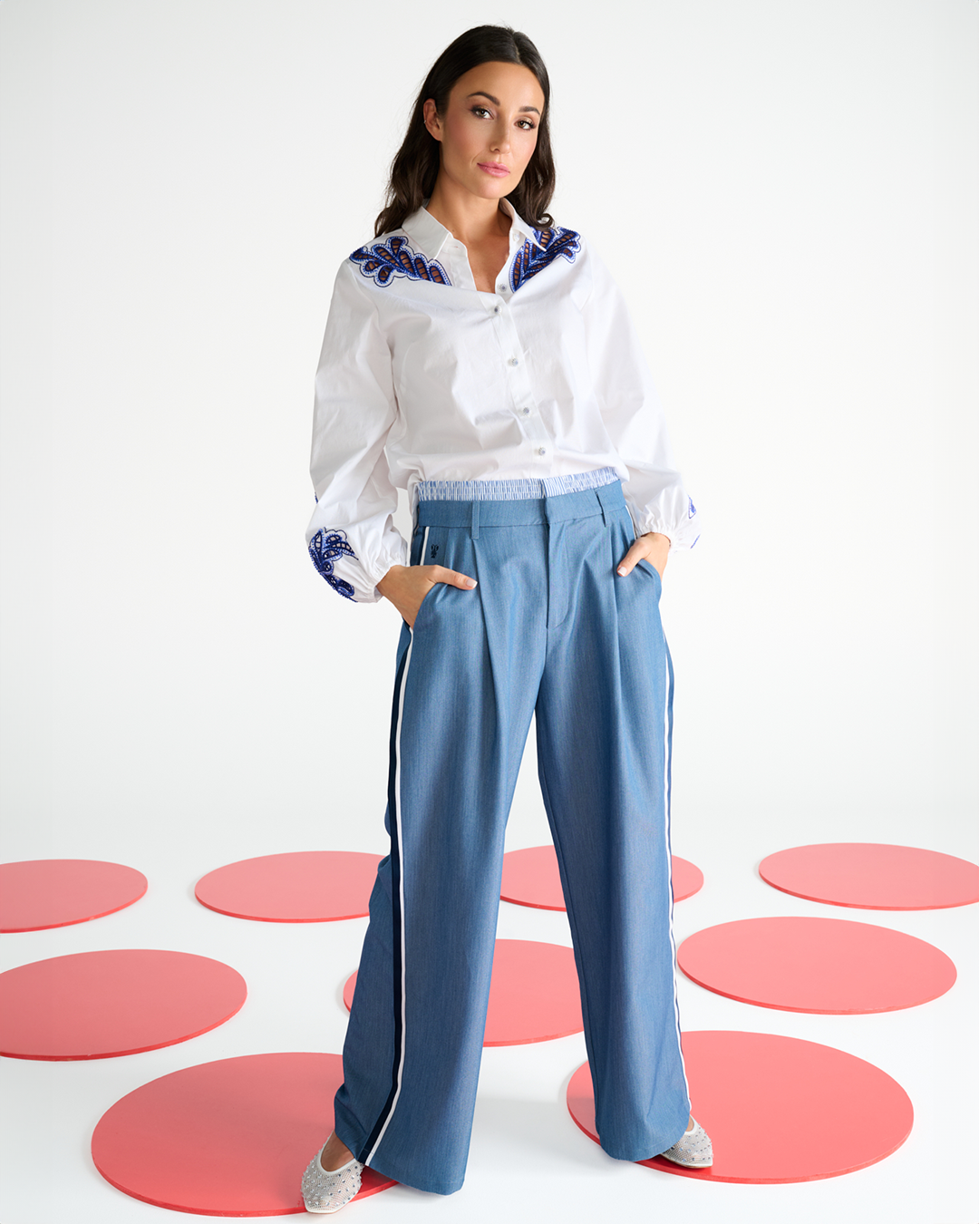 Deze prachtige blouse is een echte blikvanger. Deze kleur vormt de perfecte achtergrond voor de elegante blauwe borduursels die zowel op de schouders als de mouwen zijn aangebracht. De blouse heeft een klassieke kraag en een comfortabele pasvorm die moeiteloos om je lichaam valt, wat voor een flatterende look zorgt.