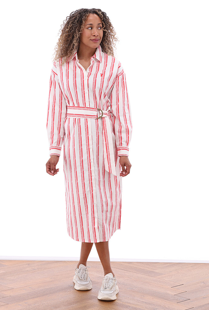 Deze prachtige maxi jurk van K-design is een echte eyecatcher dankzij de stijlvolle streepprint en de unieke kreeftdetail. Het model accentueert je taille met een bijpassende riem, waardoor je een elegant en flatterend silhouet creëert. De jurk heeft een moderne shirtjurk-stijl met een knoopsluiting aan de voorkant en lange mouwen, wat een verfijnde en tijdloze uitstraling geeft.