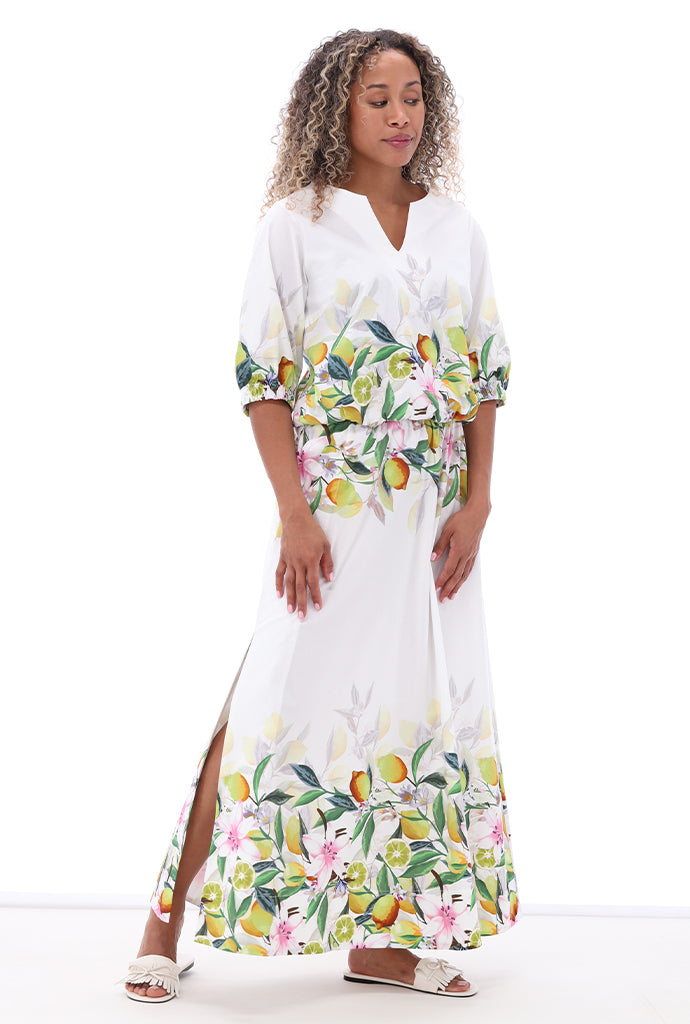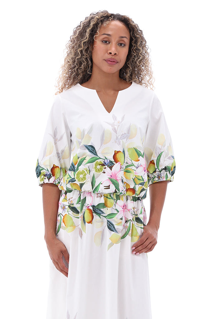 Deze opvallende top is een echte blikvanger dankzij de levendige print die je garderobe opfleurt. Het model heeft een elegante V-hals en driekwart mouwen met elastische uiteinden voor extra comfort. Met zijn luchtige silhouet is deze top perfect om je figuur te flatteren en een vleugje elegantie toe te voegen aan elke outfit.