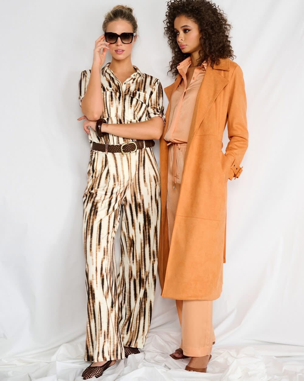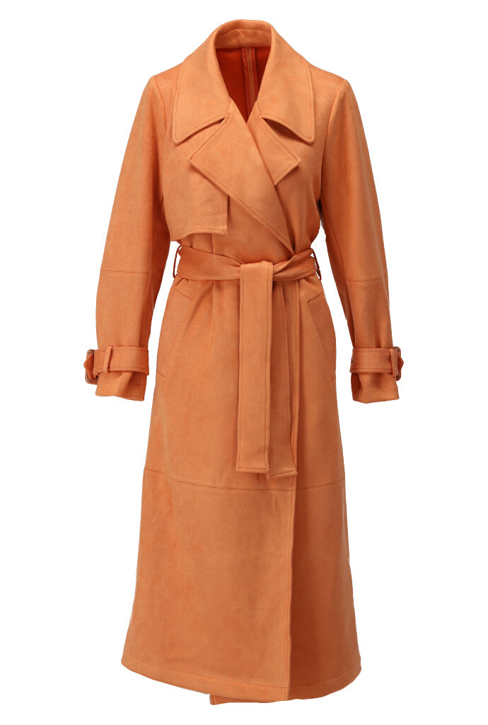 K-design - Lange jas in vegan daim met riem (A900Caramel)