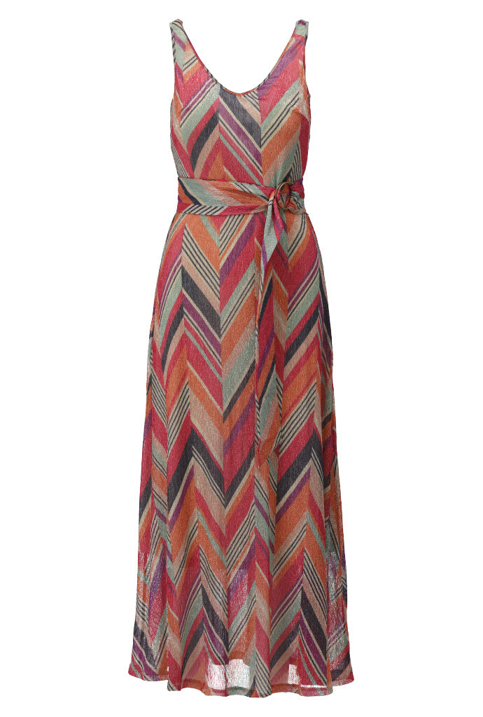 Deze maxi dress van K-Design is een echte eyecatcher dankzij de kleurrijke zigzagprint in warme tinten. De soepele glinsterende stof valt elegant en de bijpassende stoffen riem benadrukt mooi je taille. Een luchtige en feestelijke jurk die perfect is voor zonnige dagen én zomerse avonden.