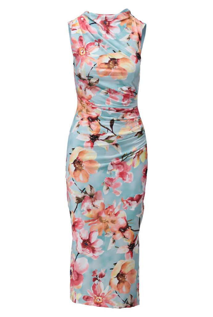 Laat je omarmen door de lente met deze betoverende bodycon dress van K-Design. De elegante bloemenprint komt volledig tot leven op een zachte achtergrond in poederblauw. Grote bloesems in warme tinten zoals koraalroze, perzik, abrikoos en botergeel zorgen voor een romantische, frisse uitstraling. De flatterende pasvorm volgt sierlijk je silhouet, terwijl de subtiele plooitjes extra elegantie toevoegen. Perfect voor een zonnige dag, een feest of een zomerse avond uit – deze jurk straalt pure vrouwelijkheid uit!