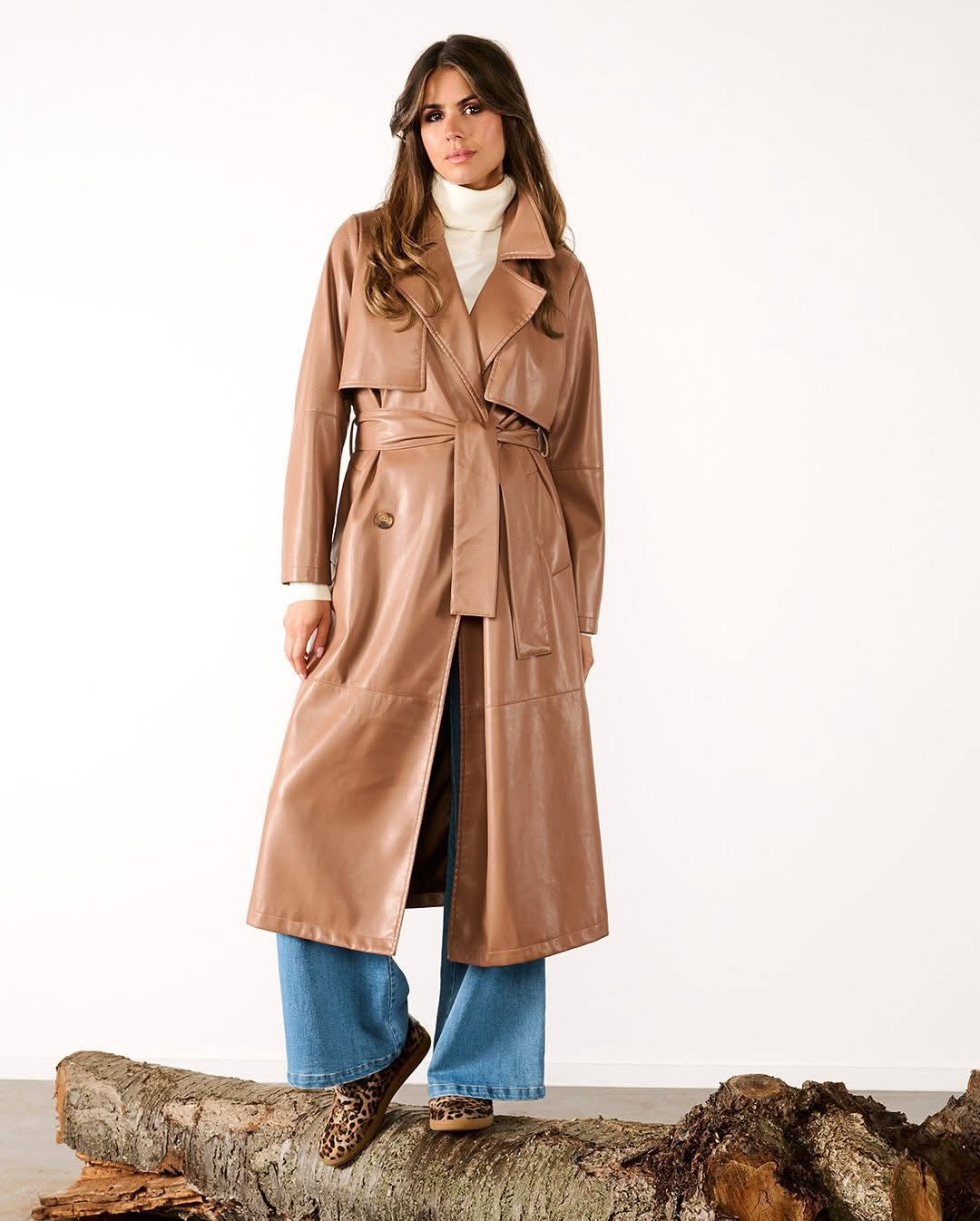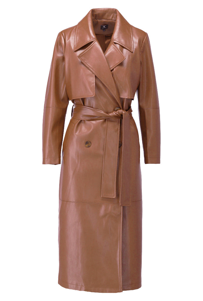 Deze K-Design trenchcoat biedt een elegante uitstraling met zijn stijlvolle revers en strikceintuur die de taille accentueert. Gemaakt van zacht kunstleer voelt het luxueus aan en biedt tegelijkertijd comfort en een tijdloze vibe. Perfect voor een chique outfit bij elke gelegenheid.