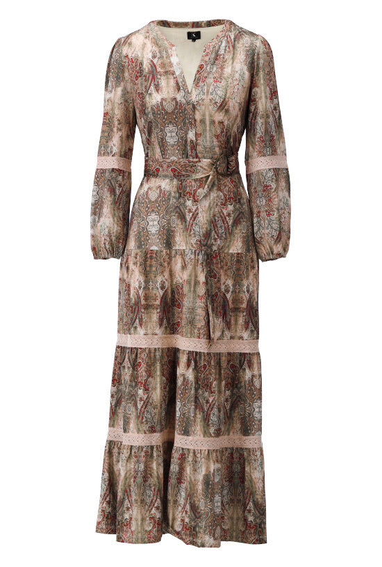 K-design - Maxi dress met print, kant en stoffen riem (X212)