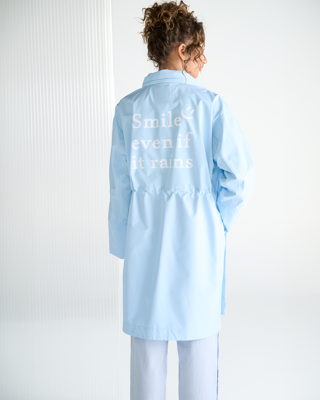 Deze stijlvolle regenjas van K-design is een must-have voor iedere garderobe, perfect voor de regenachtige dagen. Het heeft een moderne en functionele uitstraling met een opvallende tekst op de rug, 'Smile even if it rains', wat zorgt voor een vrolijke en optimistische uitstraling. De jas heeft een relaxed silhouet, waardoor hij comfortabel over je kleding heen valt.