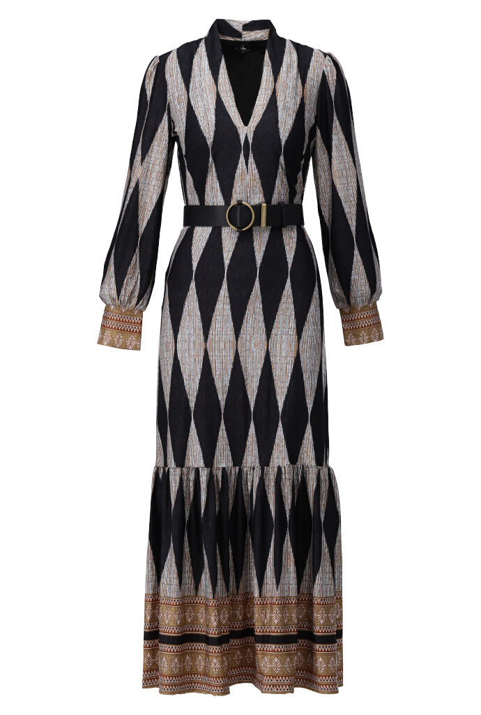 K-design - Robe longue avec imprimé, volant en bijpassende riem